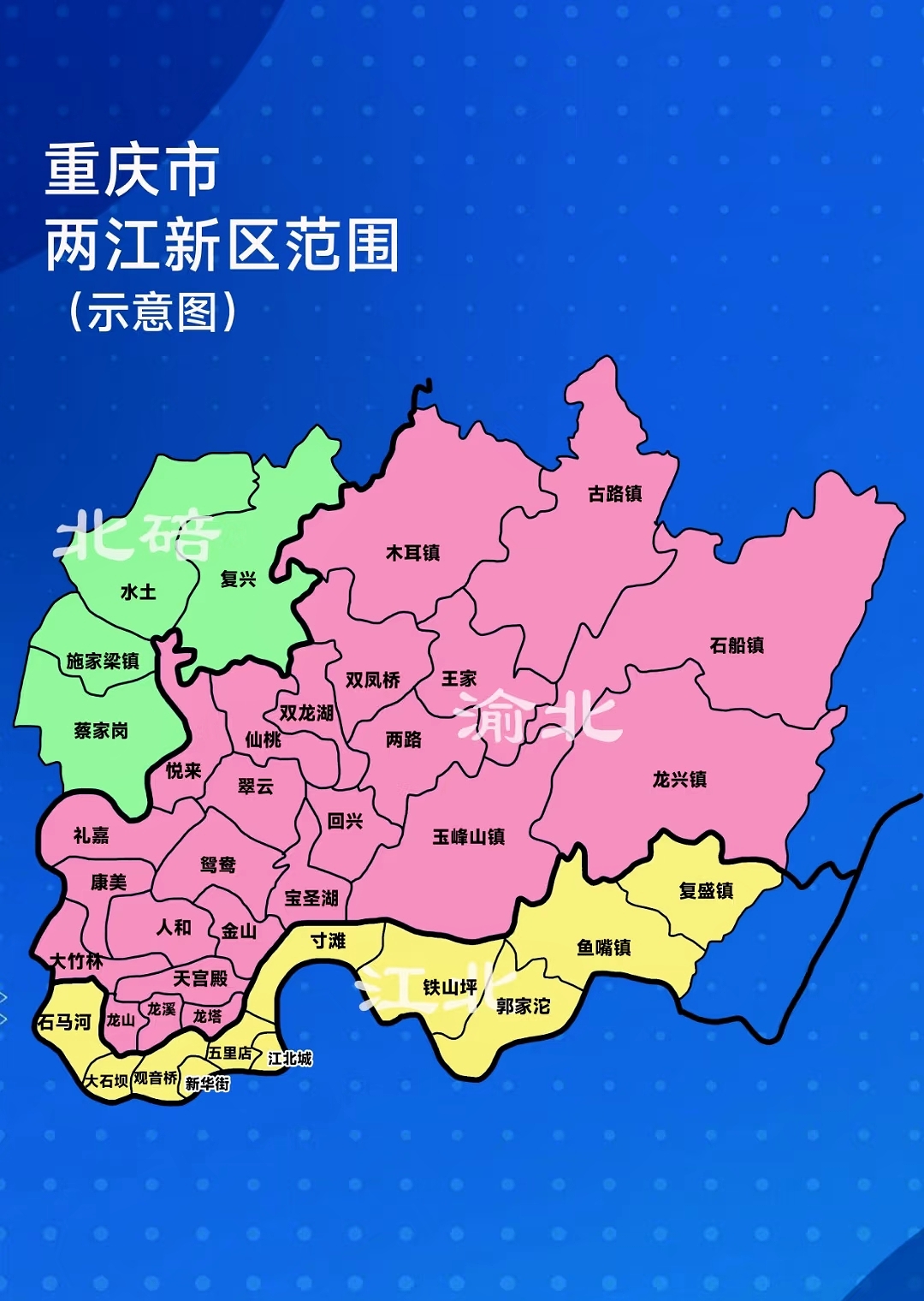 两江新区管辖范围涵盖原江北区全域、原渝北区(不含划转北碚区的5个乡镇)及北碚区5个街镇。